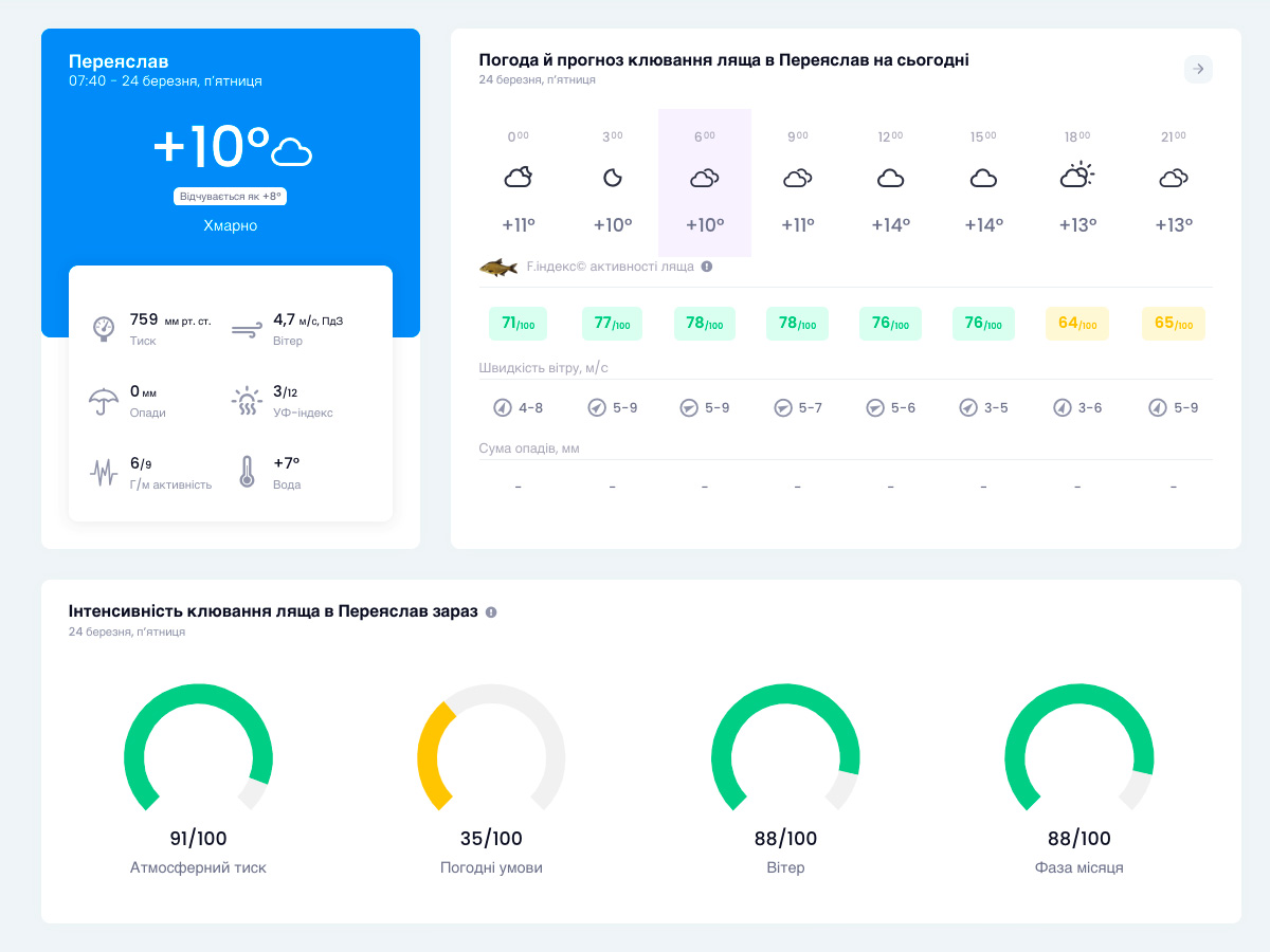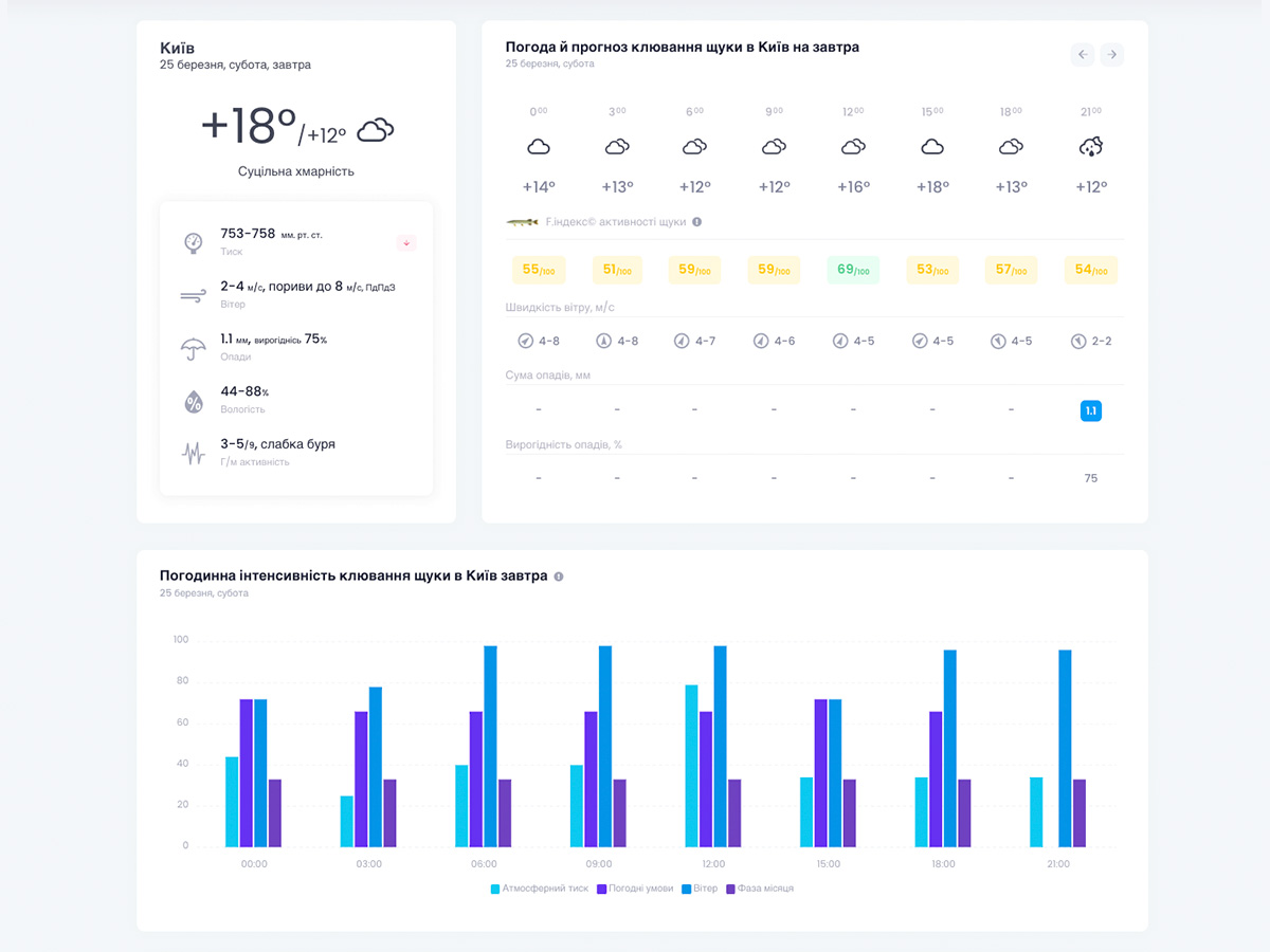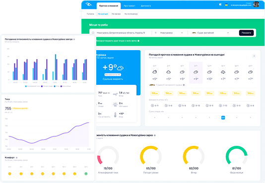 Отримуйте прогноз клювання риби, розрахований за допомогою даних з усіх звітів у базі, або даних з ваших звітів для ваших місць риболовлі.